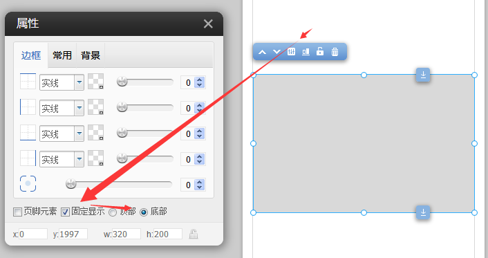 二、选中模块,点击属性 设置固定显示 (勾选)(如果需要固定在底部需要把模块放在底板中,勾选时会显示底部。